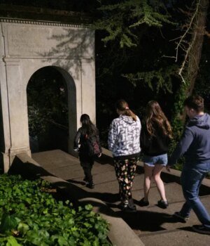 Quando estamos perto da metade dos pontos, as coisas deveriam ser assustadoras. Nosso grupo vagueia com a sombra da floresta do campus, a fonte do Redwood acima, as gotas de aranha anormalmente grandes, o vapor dos túneis subterrâneos. Um novo homem disse em seu telefone: “Ugh. Esta manhã acordei no chuveiro”.