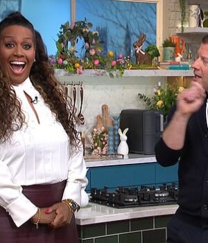 Ele também aconteceu com a torre no Dermote co-anfitrião e usava um salto com estampa de animais dobrado com uma blusa branca e uma saia bargundi.