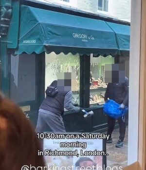 Dois homens foram vistos quebrando a vitrine da joalheria Gregory & Co com um grande martelo em 31 de janeiro, em um vídeo que desde então se tornou viral online.