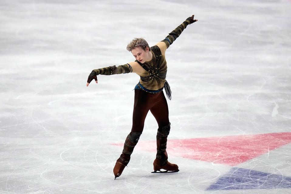 Aleksandar Selevko, da Estônia, se apresenta durante o programa curto masculino no Campeonato Mundial de Patinação Artística da ISU de 2026, em 26 de março de 2026, em Praga. (Foto de Michal Czek/AFP via Getty Images)