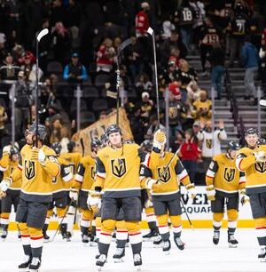 Os Vegas Golden Knights levantam seus bastões para os fãs após um jogo da NHL entre o Vegas Golden Knights e o Chicago Blackhawks, terça-feira, 2 de dezembro de 2025, em Las Vegas, Nevada.