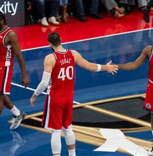 O pivô do Los Angeles Clippers, Ivica Zubac (40), enterrou a bola em dois defensores durante um jogo de basquete da NBA contra o Memphis Grizzlies, sexta-feira, 28 de novembro de 2025, em Los Angeles, Califórnia.