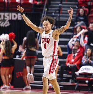 UNLV Runnin’ Rebels G Dravin Gibbs-Lawhorn (0) reage depois que seu companheiro de equipe marca uma cesta de três pontos contra o San Jose State Spartans, terça-feira, 10 de fevereiro de 2026, em Las Vegas, Nevada.