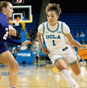 A guarda da UCLA Charlize Leger-Walker (5) dirige durante um jogo de basquete Big 10 contra Washington, quinta-feira, 19 de fevereiro de 2026, em Los Angeles, Califórnia.