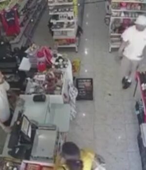 Imagens arrepiantes de CCTV de dentro da loja mostram o suposto agressor, vestindo uma camiseta branca e um chapéu, caminhando pelos corredores da loja antes de se aproximar de uma mulher parada em frente ao balcão, atingindo-a com uma lâmina no pescoço.