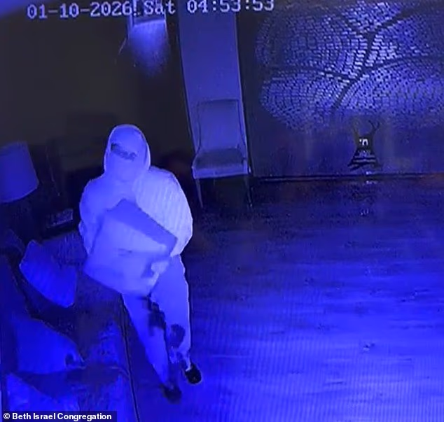 Imagens de vigilância capturaram o suspeito derramando gasolina sistematicamente no chão e nos móveis da sinagoga, garantindo que o fogo se espalharia rapidamente se acendesse.