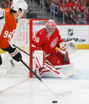 O goleiro do Detroit Red Wings, John Gibson, persegue o disco durante o primeiro período contra o Philadelphia Flyers na Little Caesars Arena.