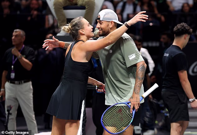 Kyrgios disse: ‘Foi uma luta muito difícil e houve pausas repetidas vezes. Não vou me considerar um campeão esta noite. Acho que ver alguém tão bom como Arina aqui e eu é realmente espetacular e um grande avanço para o jogo de tênis.