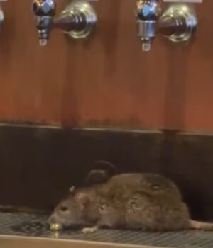Em imagens alarmantes de encontros com a vida selvagem, um rato marrom gigante está sentado sob uma parede de torneiras de cerveja, bem em frente aos clientes que jantam no bar.