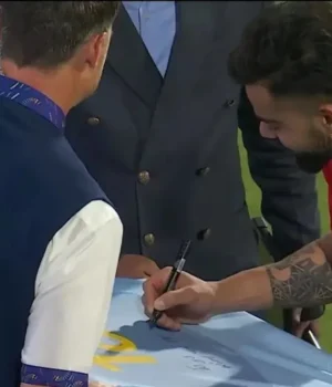 Dale Steyn foi flagrado recebendo o autógrafo de Virat Kohli em uma das primeiras camisas da Índia do batedor estrela antes da abertura do IPL 2026, que aconteceu antes da partida em Bengaluru.