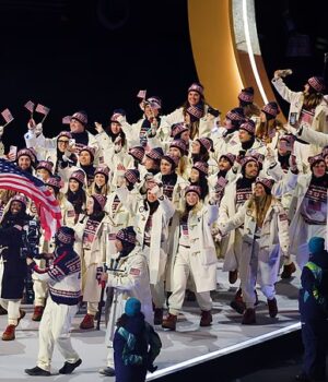 A equipe dos EUA foi liderada pela patinadora de velocidade Erin Jackson como porta-bandeira na cerimônia de abertura
