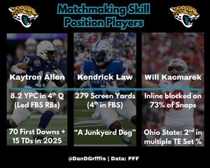 Não tenho certeza do quanto os Jaguars ainda estão tentando reforçar a área de running back após a adição de Chris Rodriguez como agente livre, mas se eles quiserem atacar a posição nas primeiras quatro rodadas, Kytron Allen da Penn State é o cara.