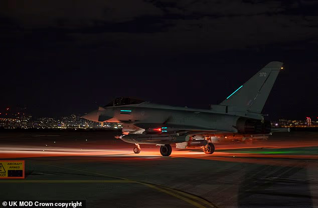 Uma aeronave Typhoon da Royal Air Force é vista aqui na decolagem antes de um ataque planejado.