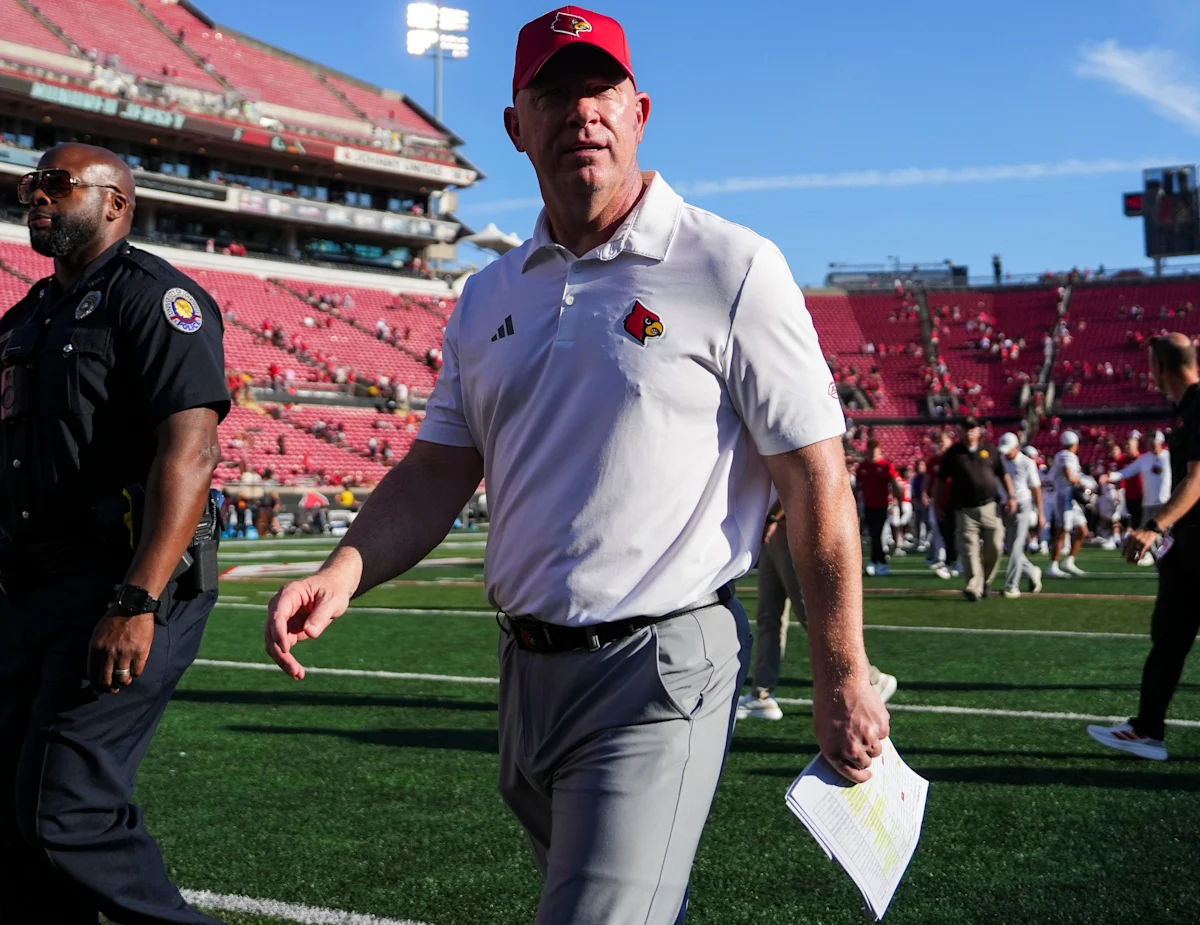O técnico de futebol de Louisville, Jeff Brohm, sai de campo após a derrota de seu time para o Eastern Kentucky no L&N Federal Credit Union Stadium.