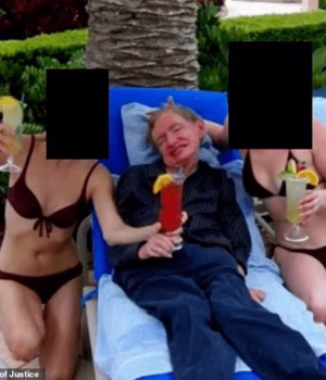 Divulgada pelo DOJ, a foto mostra Hawking, falecido em 2018, sorrindo de orelha a orelha enquanto posa entre duas caipiras carregando bebidas tropicais.