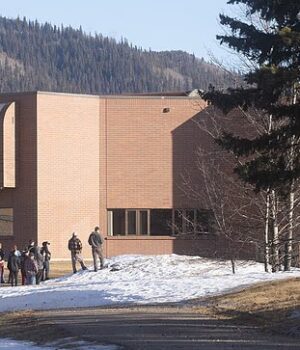 Alunos são fotografados do lado de fora da Escola Secundária Tumblr Ridge, no Canadá, na terça-feira, depois que o atirador transgênero Jesse Strang matou 10 pessoas.