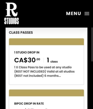 E as capturas de tela do número de preços do estúdio mostram uma diferença colorida clara: para clientes brancos uma única aula de estúdio e apenas US $ 15 para o BIPOK Drop-In.