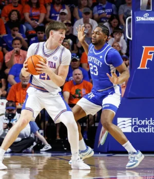 Flórida (19-6, 10-2 Conferência Sudeste) foi 1-4 contra Kentucky (17-8, 8-4) sob o comando do técnico Todd Golden. Mas os Gators lideraram fio a fio e terminaram com uma vantagem de rebote de 45-37. Condon e Chinielu pegaram 11 tabuleiros, ambos terminando com duplo-duplo.