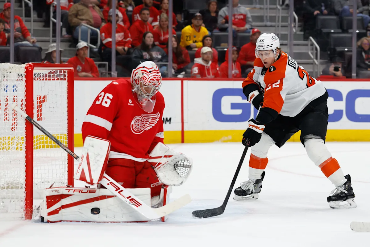 Este artigo foi publicado originalmente no Detroit Free Press: John Gibson, goleiro do Detroit Red Wings, sai no 2º período contra os Flyers