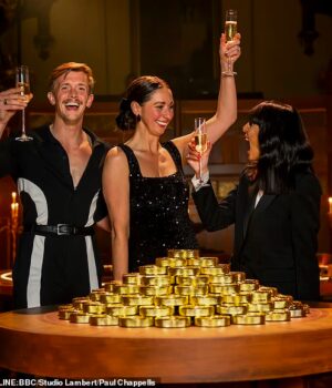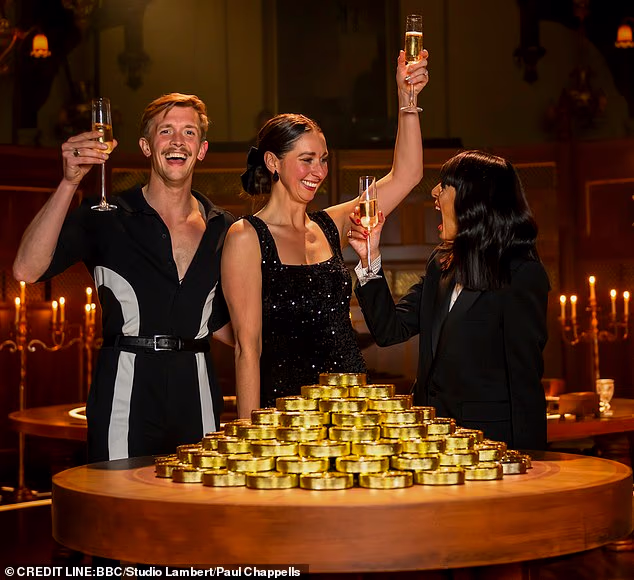 Claudia Winkleman, à direita, com os traidores vencedores Stephen Libby e Rachel Duffy
