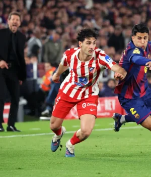 Na La Liga, o Atleti está 22 pontos atrás do primeiro colocado Barcelona, ​​faltando sete partidas para o fim, mas está na quarta e última vaga para a qualificação para a Liga dos Campeões de 2026-27.