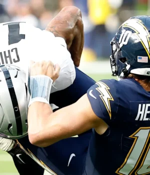 Herbert machucou a mão esquerda em uma disputa de 1 jarda depois que Jeremy Chinn derrubou o quarterback no chão. A mão de Herbert bateu contra a grama.