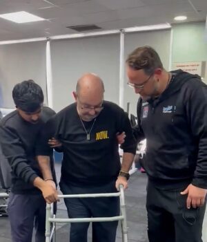 A filmagem postada nas redes sociais mostra que o pai dá um breve passo enquanto para um andador em surpresa para o filho.