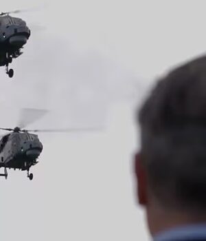 O clipe, com o riff de guitarra do hit do Dire Straits, ‘Money for Nothing’, abre com imagens de um helicóptero Wildcat da Marinha Real voando sobre a cabeça do líder trabalhista.