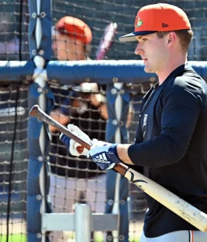 O shortstop do Detroit Tigers, Kevin McGonigle (85), se prepara para praticar rebatidas antes de um jogo contra o Atlanta Braves durante o treinamento de primavera no Coolday Park na terça-feira, 24 de fevereiro de 2026, em North Port, Flórida.