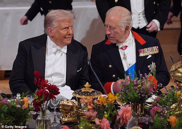 O Palácio de Buckingham confirmou que o Rei e a Rainha Camilla queriam ‘cumprir seus deveres’ – eles devem chegar aos EUA conforme planejado na tarde de segunda-feira. Na foto: Trump e o Rei Charles participam de um banquete de estado no Castelo de Windsor durante sua visita de estado aos EUA em setembro de 2025