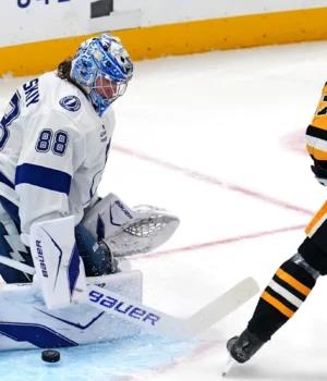 Moser deu ao Lightning uma vantagem de 1 a 0 faltando 5:47 para o fim do terceiro período. Yanni Gourde trouxe o disco para a direita e chutou para Siloves, que o goleiro segurou contra as almofadas. Mas Pak Rolou e deitou na frente e Moser patinou.