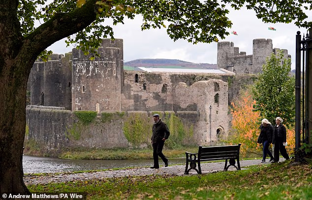 As pessoas passam pelo Castelo de Caerphilly em Caerphilly, País de Gales, enquanto um alerta meteorológico âmbar é emitido para chuva.