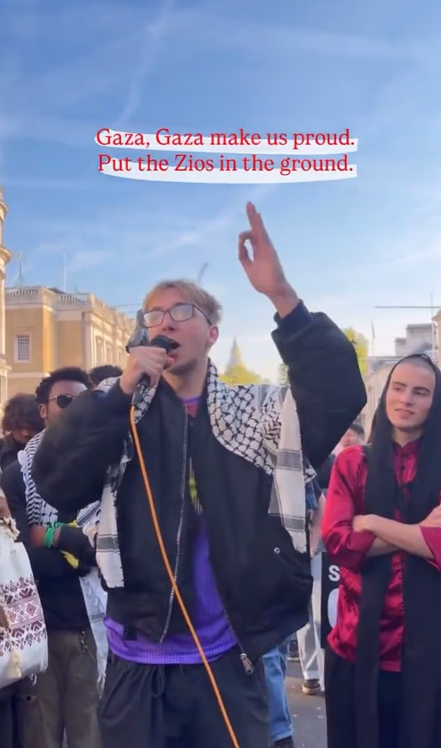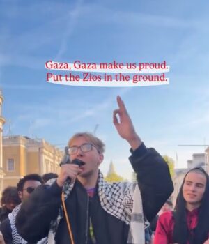 Num vídeo publicado nas redes sociais, o tipo que veste Kefieh ‘junta-se’ e grita: ‘Gaza Gaza, deixe-nos orgulhosos, coloque Zios no chão.’