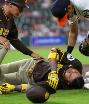 A primeira base de Astros correu direto para a imersão de Astros quando o arranjo foi interrompido diretamente depois que o sacrifício foi interrompido. Os acordos e os submersão foram estritamente colididos e ambos imediatamente esmagaram o chão. A matriz estava diretamente no ombro esquerdo, e ele ficou completamente imóvel por um tempo, enquanto o primeiro treinador base de DiPage e Padres o testou.