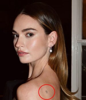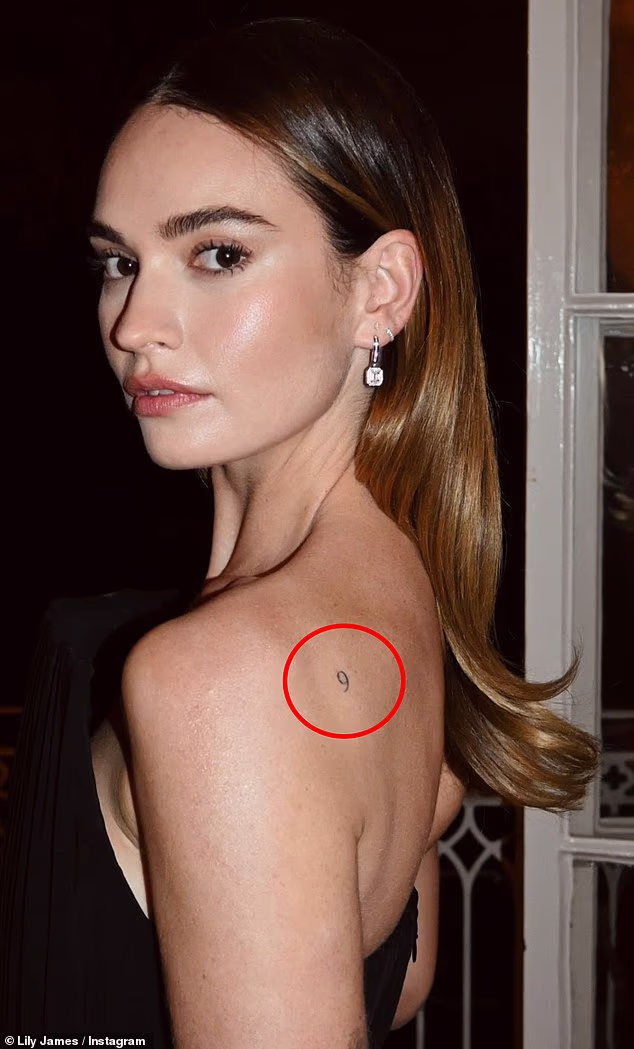 Lily James, 36, exibiu sua pequena tatuagem enquanto deslumbrava com um vestido preto Stella McCartney para o Legends Gala no Museu de História Natural de Londres na quinta-feira.