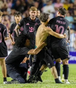 A vitória do Miami por 2 a 1 para encerrar uma série de jogos internacionais terminou em caos total, depois que vários torcedores entraram em campo aos 89 minutos. O primeiro estava sem camisa. O segundo e o terceiro usavam camisetas de Lionel Messi, uma de Miami e outra de Barcelona, e naturalmente queriam uma selfie com o craque.