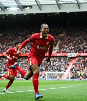 O zagueiro do Liverpool, Virgil Van DJC, celebra a pontuação contra o West Ham (Paul Alice)