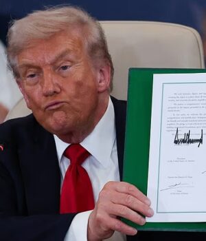 Após o acordo de cessar-fogo na segunda-feira, 8 de outubro de 2021, o presidente Donald Trump colocou um documento assinado durante uma cimeira para apoiar o fim da guerra Israel-Hamas em Gaza há mais de dois anos em Gaza.