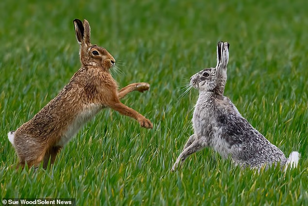 As lebres ‘encaixam’ umas às outras enquanto a fêmea ‘luta contra a atenção indesejada’ do macho – mas neste caso o macho tinha uma característica rara.