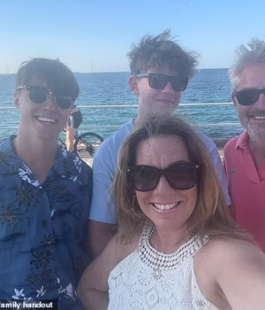Emma Webber (frente) com o marido Dave (atrás à direita) e os filhos Bernie (esquerda) e Charlie (atrás ao centro) nas últimas férias em família em Palma em 2022, um ano antes de Barney ser morto a facadas em Nottingham.