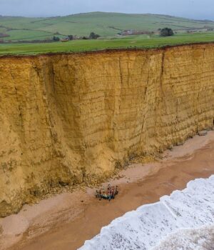 Apesar dos sinais de alerta aconselhando o público a ficar longe da montanha, o grupo se reuniu a poucos metros da base durante uma viagem de campo à Costa Jurássica.