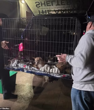 Fotos compartilhadas pelo abrigo mostraram trabalhadores ajudando gaiolas cheias de cachorrinhos aterrorizados a entrar em um caminhão.