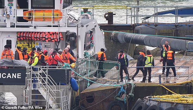 Migrantes desembarcam hoje do catamarã da Força de Fronteira do Reino Unido, Hurricane, no porto de Ramsgate, em Kent
