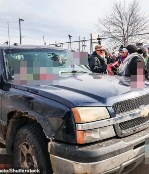 ‘Pessoal, pessoal!’ Um dos manifestantes – aparentemente chegando à chocante conclusão de que perderam o controle – grita enquanto os outros correm até o caminhão, enfiando vibradores no capô. ‘Por que você está fazendo isso?’