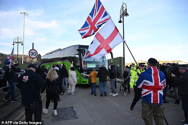 Anteriormente, um comboio de manifestantes fez uma marcha lenta do pub The Golden Lion em direção ao porto, forçando o tráfego na A20 a se arrastar enquanto eles gritavam ‘Basta, mande-os de volta’ e ‘Care Starmer está bem feito’.