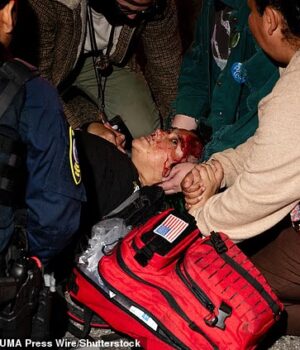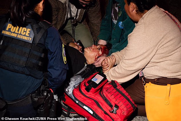 Uma mulher não identificada foi vista sangrando na cabeça enquanto outros manifestantes e uma oficial do Departamento de Segurança Interna (DHS) a cercavam.