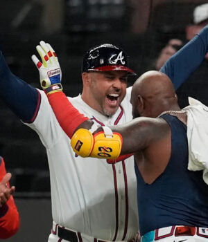 Depois de assumir a liderança por 2 a 0 no topo do XI, Austin Riley Ozuna dobrou a casa Ozi Albis antes do segundo home run no parque de confiança vazio perto dele.