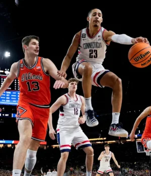 UConn recebeu outra cesta crítica de 3 pontos de Braylon Mullins e os Huskies do técnico Dan Hurley estão de volta ao jogo pelo título nacional, em busca de seu terceiro campeonato em quatro temporadas depois de derrotar Illinois por 71-62 na Final Four na noite de sábado.
