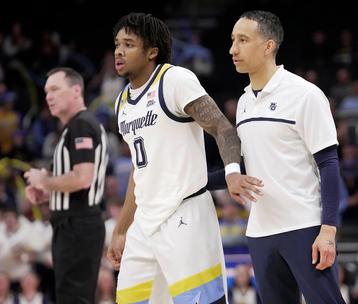 O técnico do Marquette, Shaka Smart, é mostrado durante o segundo tempo do jogo na quarta-feira, 18 de fevereiro de 2026, no Fisher Forum em Milwaukee, Wisconsin. John’s venceu Marquette por 76-70.