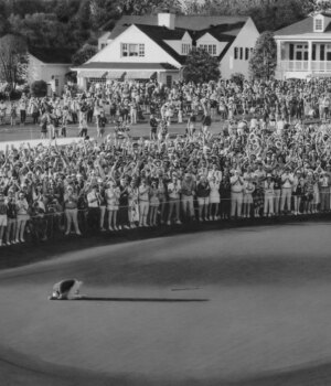 McIlroy instruiu Hall a pintar um retrato da cena no 18º green, quando sua tacada vencedora caiu e McIlroy caiu de joelhos.